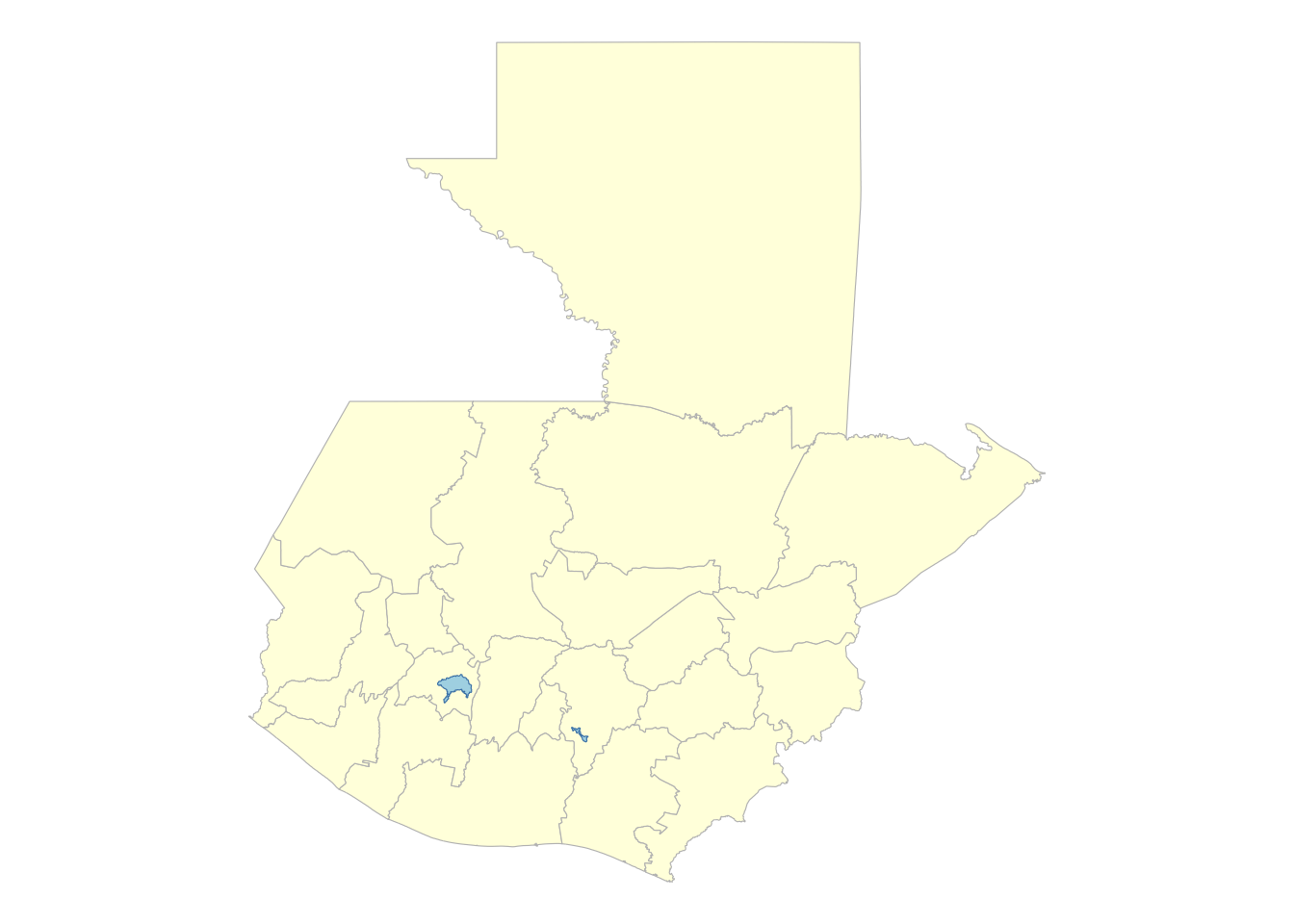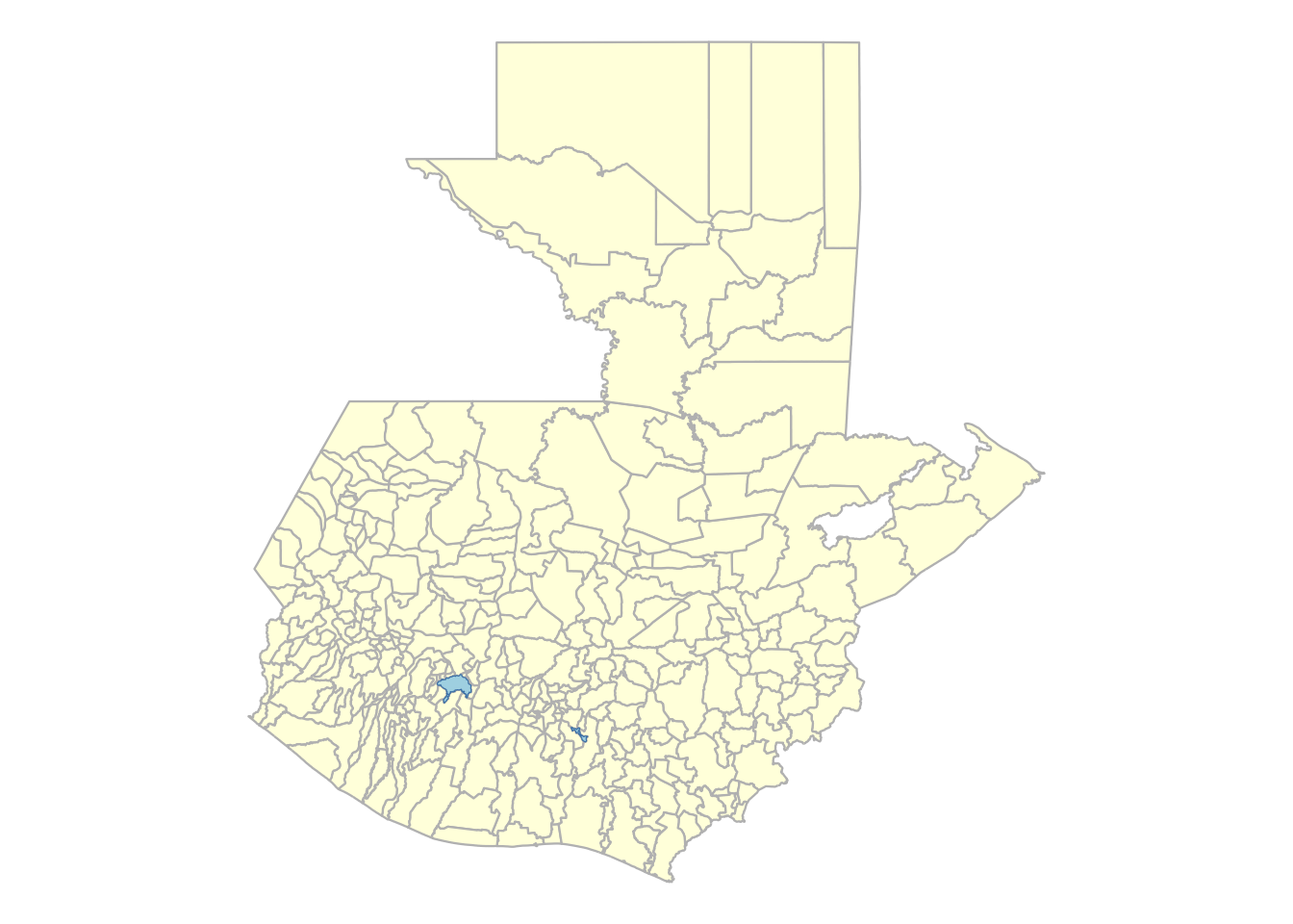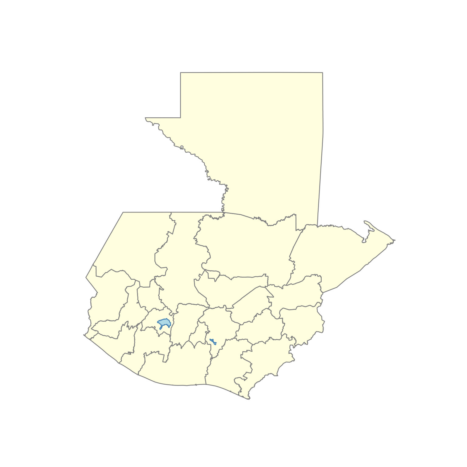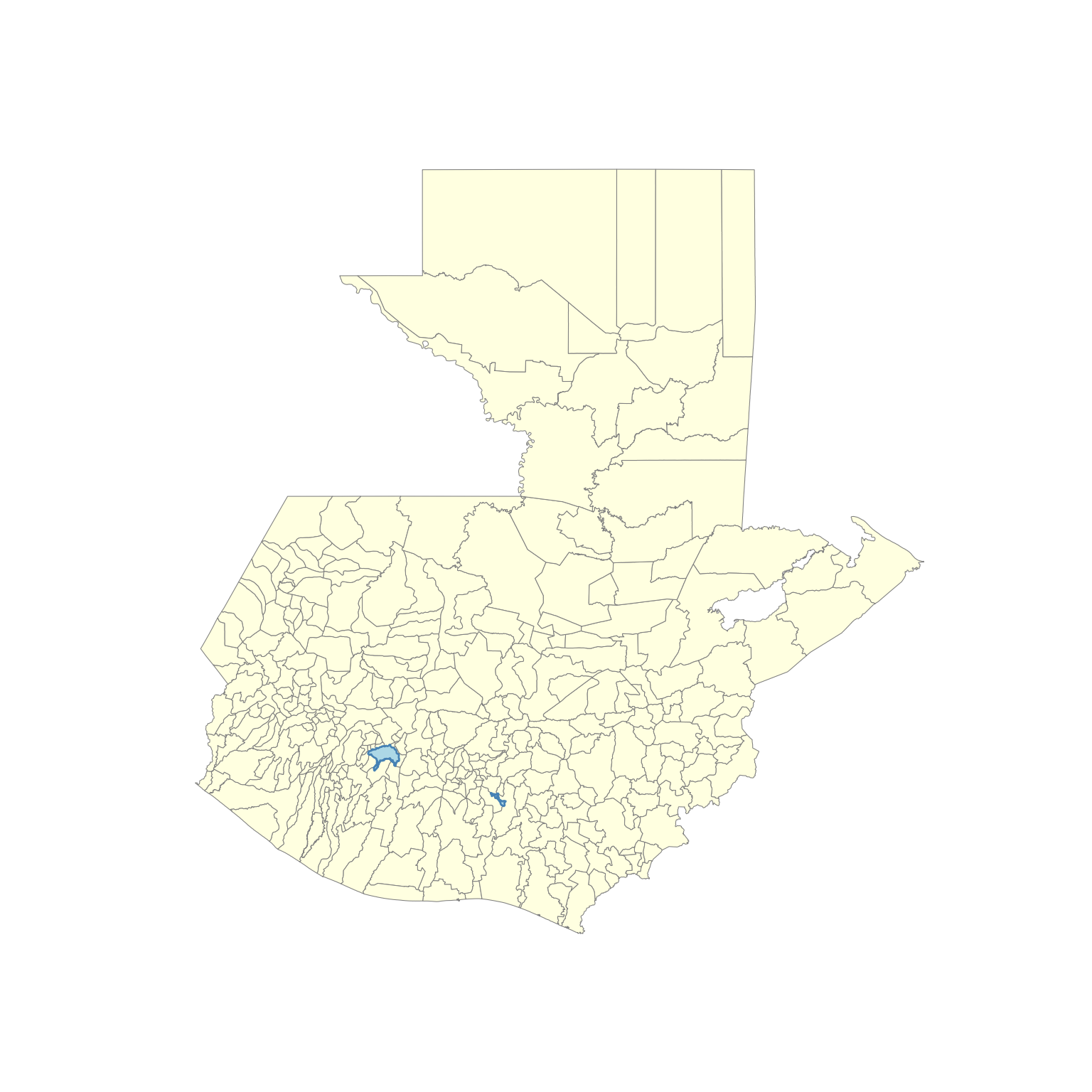 library(geoquetzal)library(ggplot2)ggplot() +geom_sf(data =municipios(), fill ="lightyellow", color ="gray", linewidth =0.4) +geom_sf(data =lagos(), fill ="lightblue", color ="steelblue") +theme_void()