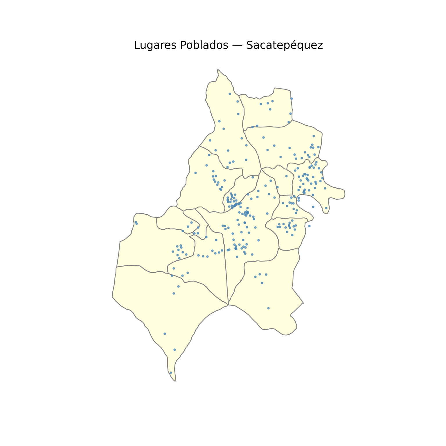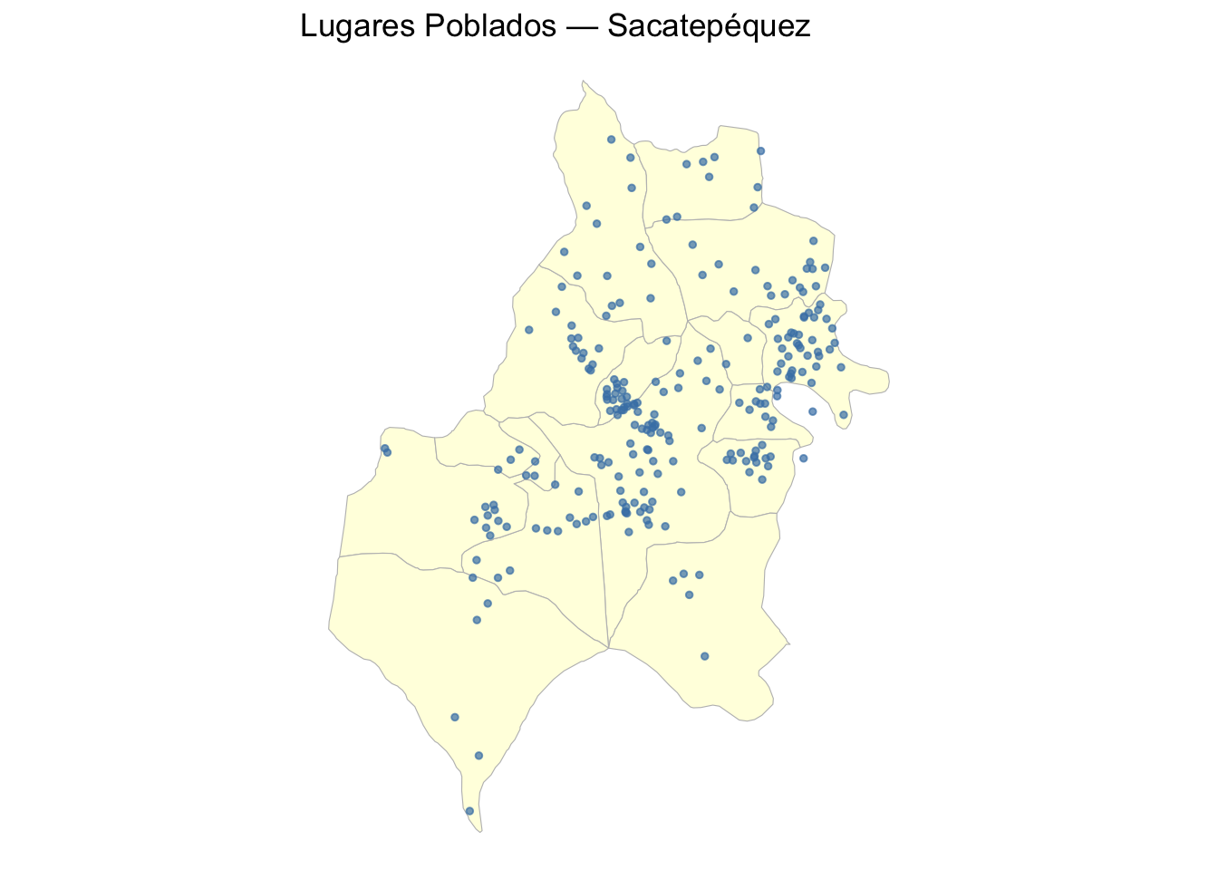 lp_valid <- lp[!is.na(lp$longitud) &!is.na(lp$lat), ]lp_sf <- sf::st_as_sf(lp_valid, coords =c("longitud", "lat"), crs =4326)# Superponer sobre municipiosggplot() +geom_sf(data =municipios("Sacatepequez"), fill ="lightyellow", color ="gray") +geom_sf(data = lp_sf, color ="steelblue", size =1, alpha =0.7) +ggtitle("Lugares Poblados — Sacatepéquez") +theme_void()