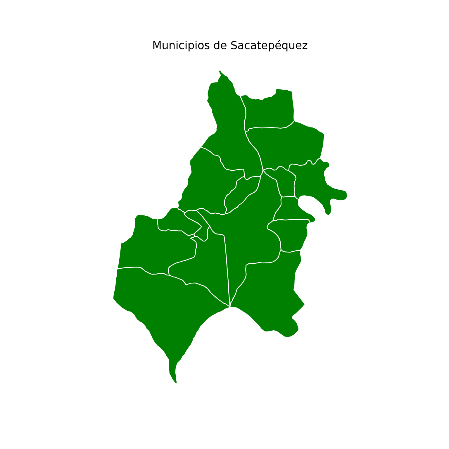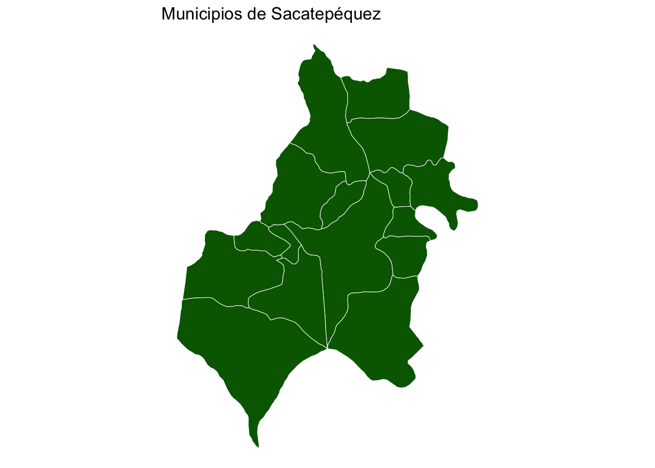 library(geoquetzal)library(ggplot2)ggplot() +geom_sf(data =municipios("Sacatepequez"), fill ="darkgreen", color ="white") +ggtitle("Municipios de Sacatepéquez") +theme_void()